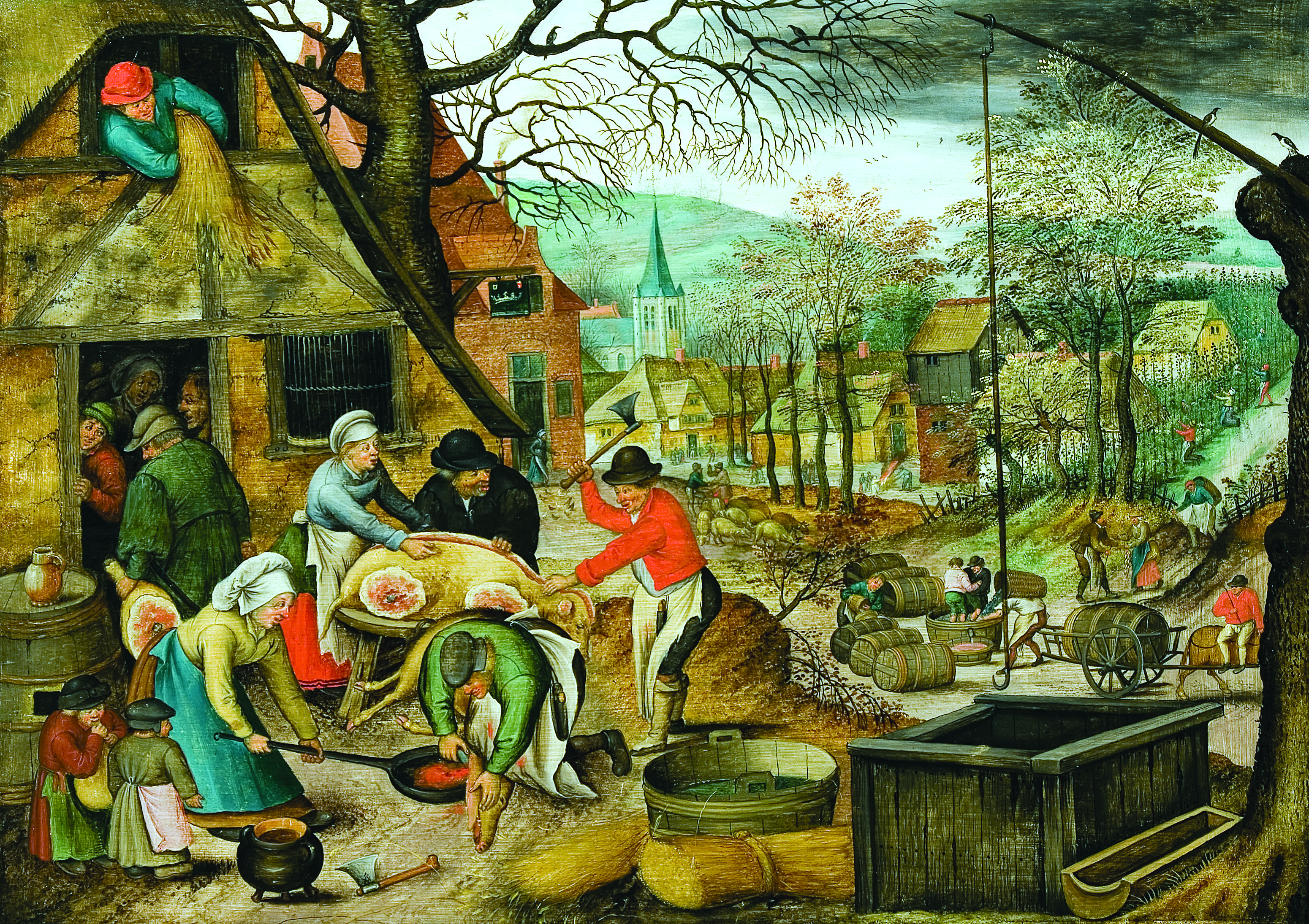Autumn focuses primarily on pig slaughter and meat curing, which take up the entire foreground. Grape picking and wine making are minutely depicted in the middleground where people are stomping the grapes in a low wooden vat while the village seems to fade away into the distance.