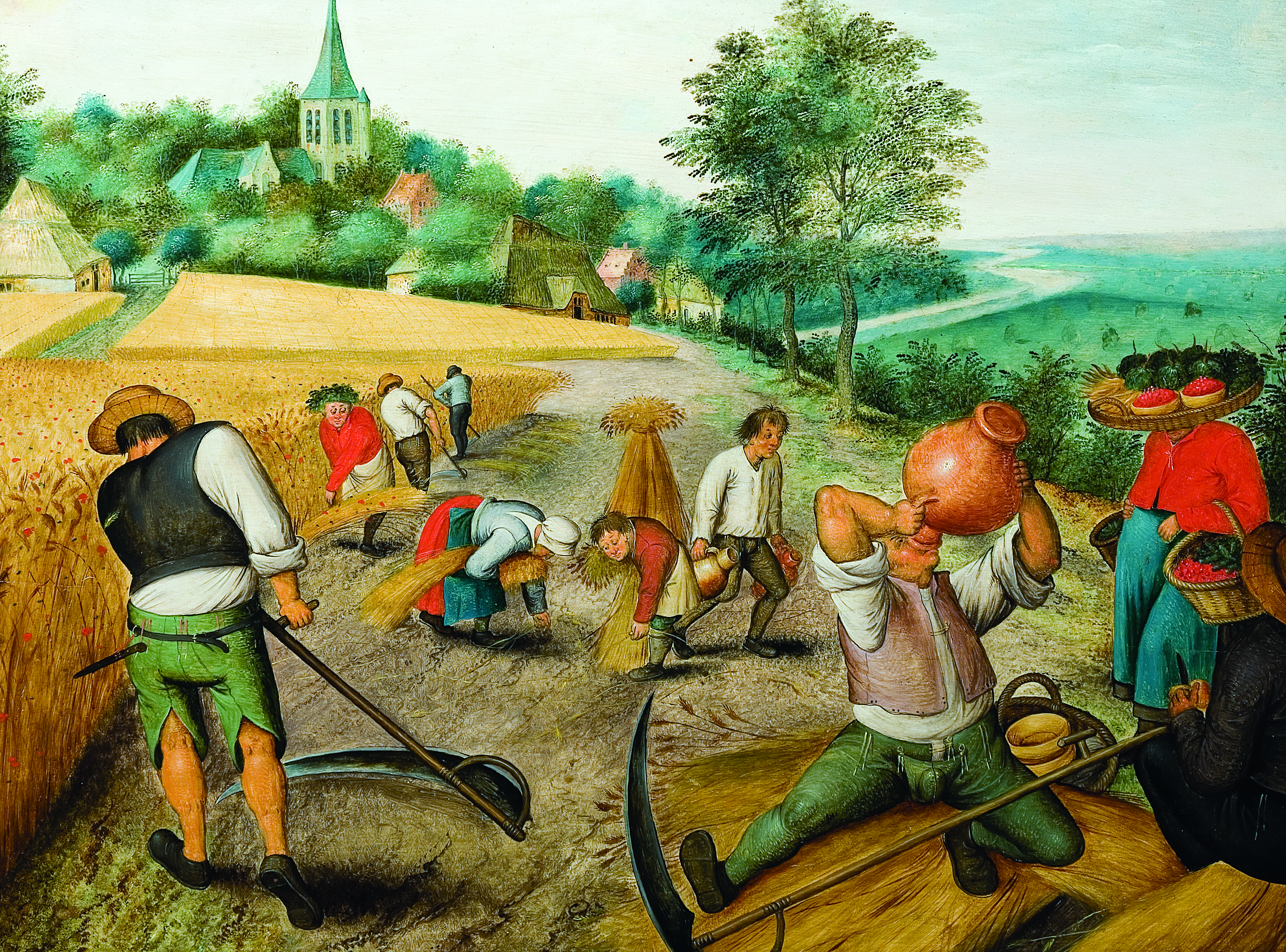 Summer is all about harvest time. Fruit picking (mouth-watering red cherries are carried by the woman coming from the right of the image!) and wheat gathering are complemented by hay stacking: small pyramids dot the blueish background. Busy people show there is a job out there for every member of the community, male or female, young or old.